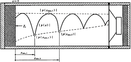 驻波比法是一种利用驻波现象来测量材料吸声系数和声阻抗的方法。具体来说,如图2所示,该方法的基本原理是声波在阻抗管中传播时,会在材料表面发生反射,从而在管内形成驻波。驻波是由于反射声波与入射声波在管内相遇并相互干涉所形成的。通过测量驻波中的最大声压(反射声压峰值)和最小声压(反射声压谷值),可以计算出驻波比(SWR, Standing Wave Ratio)。